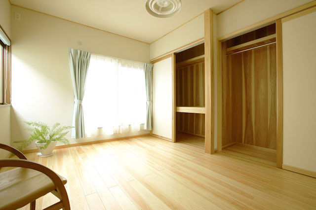 洋間の収納は内側まで丁寧に無垢板張りにしています。